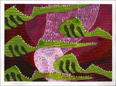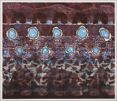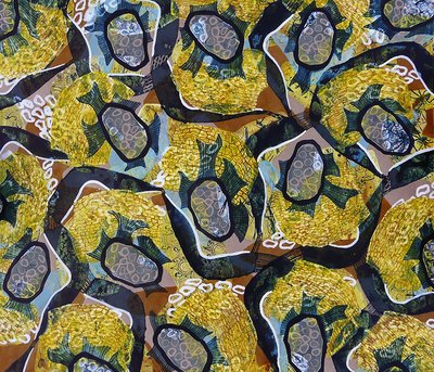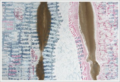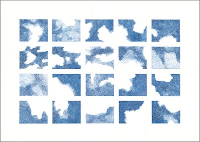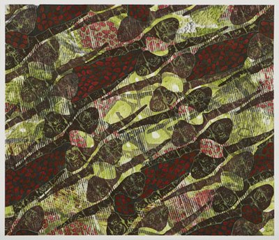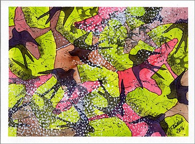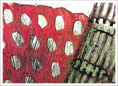Im vergangenen Jahr wurde ich zu einer Druckwerkstatt nach Löhma eingeladen. Solche Angebote, das eigene Atelier zu verlassen, Neues auszuprobieren und zeitweilig gemeinsam mit Kollegen zu arbeiten, sind für mich sehr reizvoll. Bei diesen Gelegenheiten versuche ich, von meiner gewohnten Arbeitsweise einen Bogen zum Neuen zu schlagen. Das Neue waren für mich in diesem Fall die Drucktechniken. Das Gewohnte lag im absichtslosen Punkte setzen, im Entstehenlassen- über dieses Projekt habe ich bereits ausführlich geschrieben. ("Die Poesie der Absichtslosigkeit", Oktober 2013)