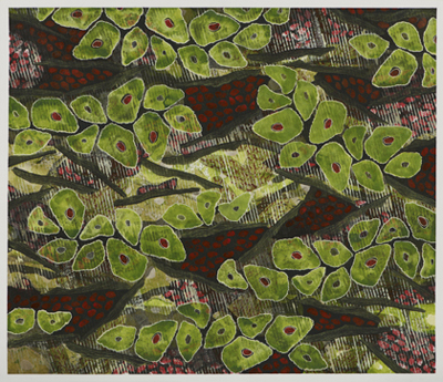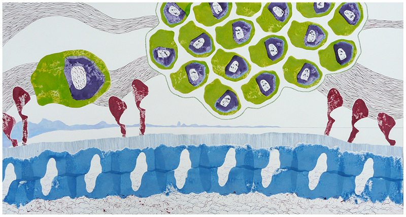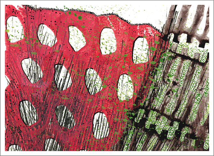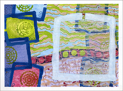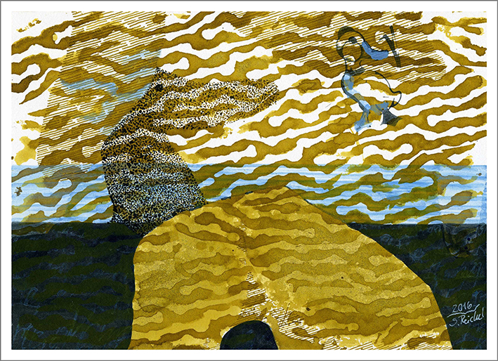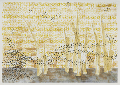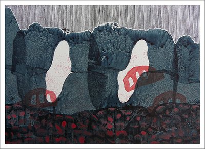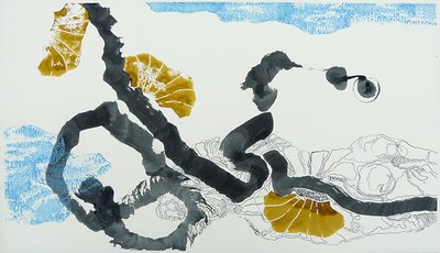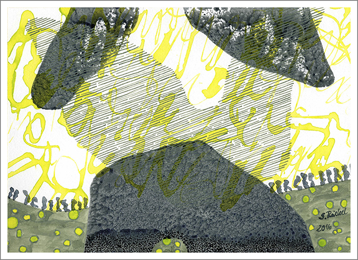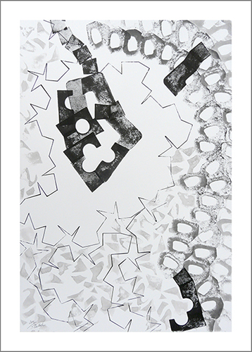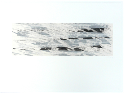 Dies führte bei mir im Atelier, einige Zeit später, zu einer Überlagerung all dieser Eindrücke in der vorliegenden Linografie.