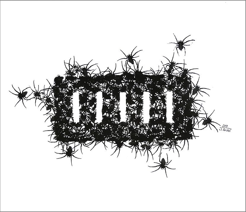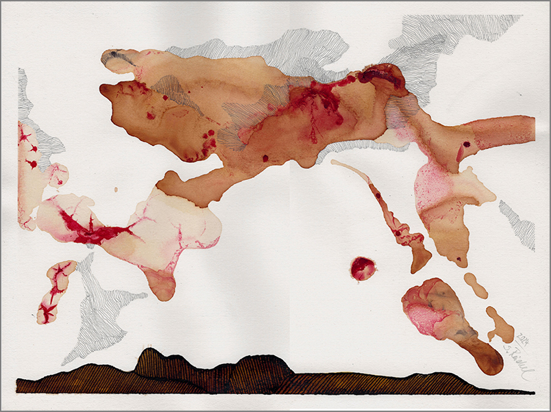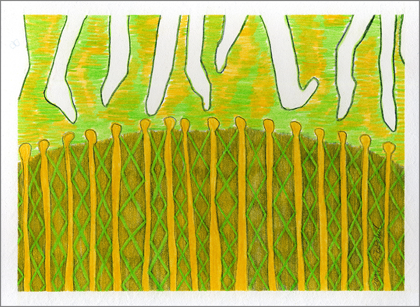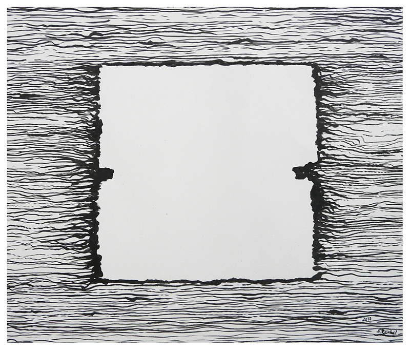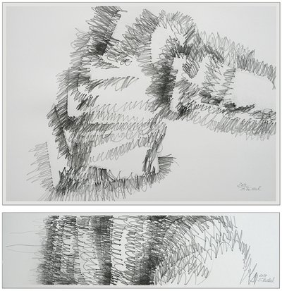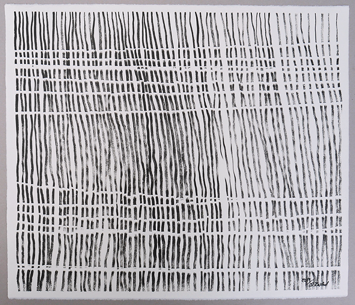 Für die Zeichnung „Darüberhinweg“ spannte ich Schnüre über das Blatt und ließ mich davon beim Zeichnen „stören“. Der Pinselstift „stolperte“ jeweils über die einzelnen Fäden und hinterließ Lücken. Oder sehen Sie Freiräume?
