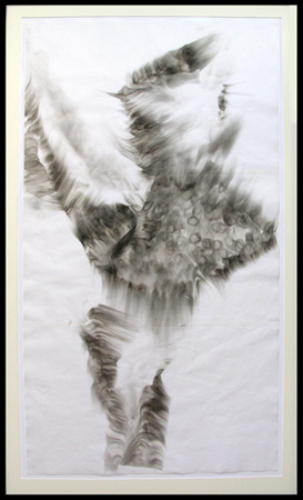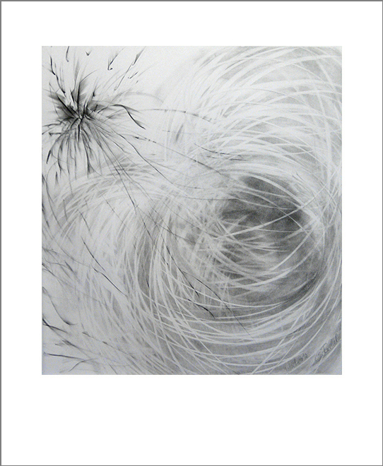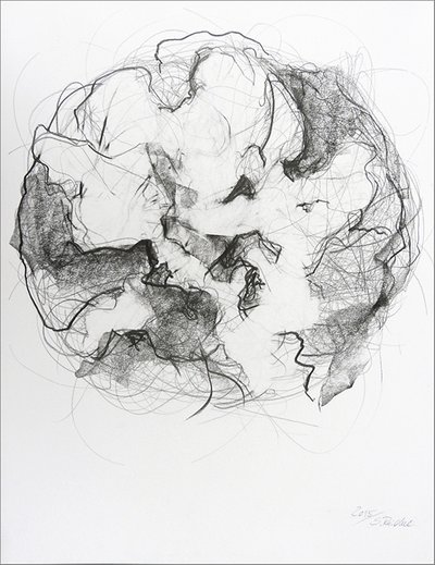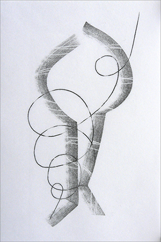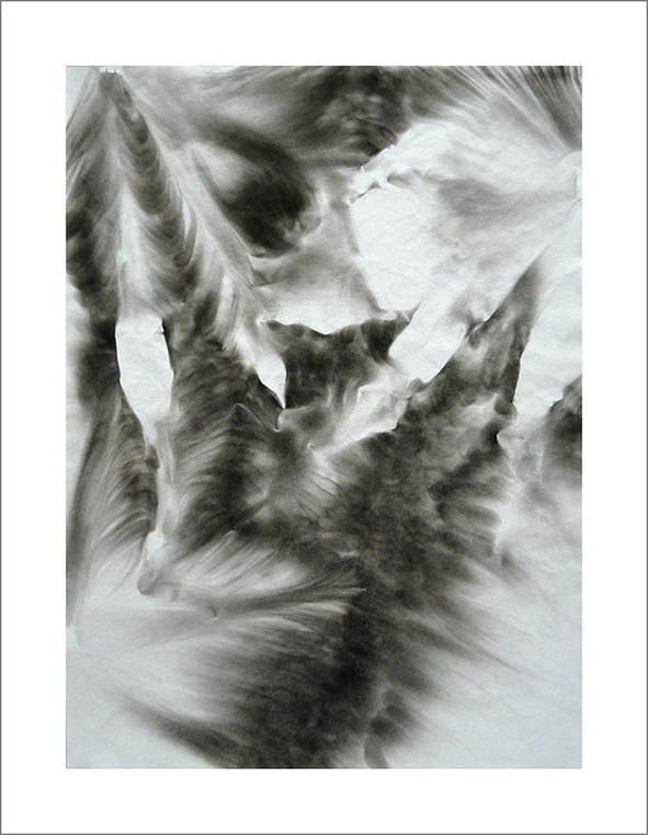 Mit Grafitpulver zeichne ich eher schwungvoll aus dem ganzen Körper heraus, fast schon vollführe ich einen Tanz auf dem Papier. Insofern ist diese Arbeit auch ein körperliches Nachvollziehen der realen Begegnung, eine Choreografie vielleicht.