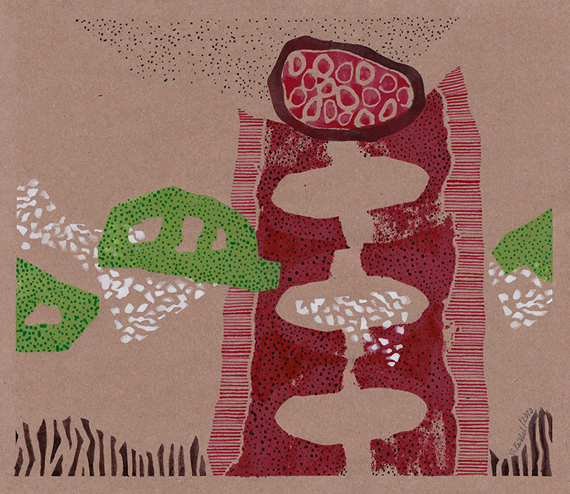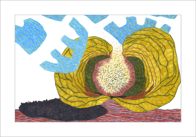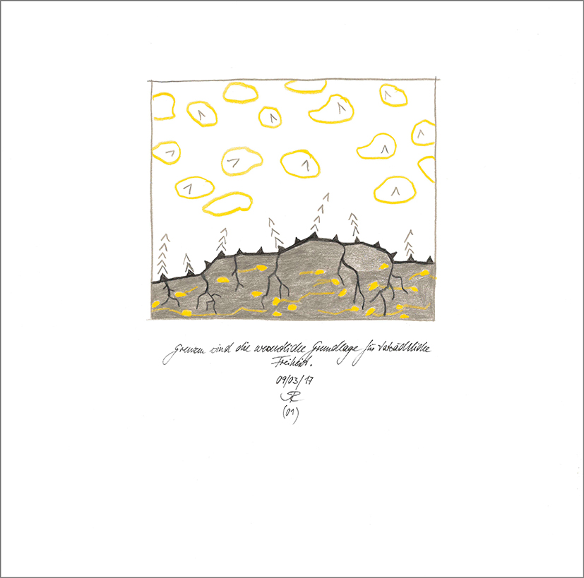 Mich interessierten beim Zeichnen damals besonders Aspekte der Komposition: Welche Gebilde erhalten durch ihr Aussehen und ihre Lage Bedeutung? Einige Formen kommen im Bildraum nach vorn, andere bleiben im Hintergrund.