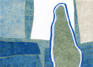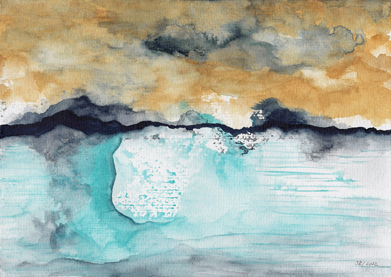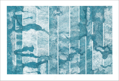 Vor einigen Jahren zeichnete ich in einer Serie von sechs Arbeiten einige Muster und Strukturen dazu. Das eisblaue Bild schien mir wegen seiner Farbigkeit nun für den Dezember als Angebot besonders passend.