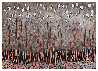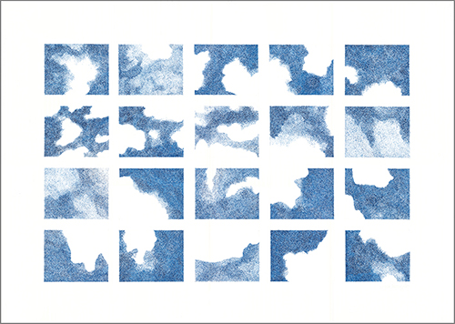 Diese Zeichnung gehört zu einer ganzen Reihe von Arbeiten, die in diesem Jahr enstanden sind. Sie hatten zwei Überschriften für mich: zum einen das Hinhören und zum anderen die Poesie der Absichtslosigkeit. Ich nutze oft das Telefon, um von Mötzelbach aus meine Kontakte aufrecht zu erhalten. Während zahlreicher Telefonate habe ich mich entschieden, dem achtsamen Hinhören in Form von absichtslos gepunkteten Bildern Ausdruck zu verleihen. Daraus entstand diese Reihe.