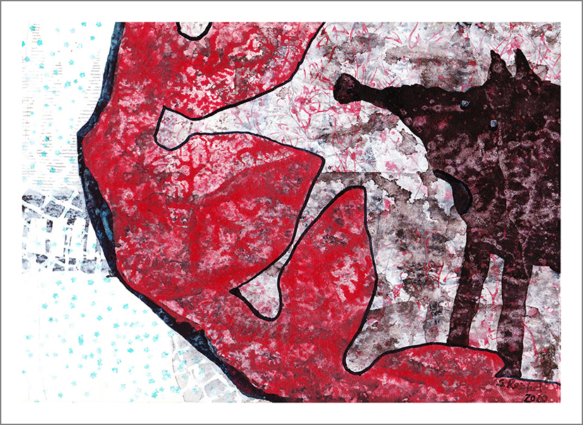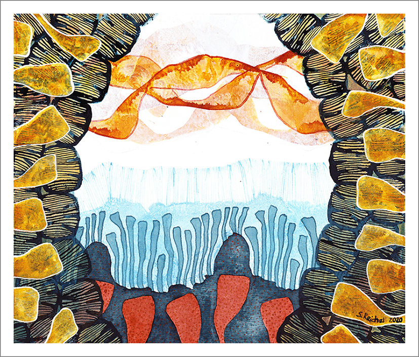 Im Oktober beschäftigte mich bildnerisch die Durchlässigkeit von Grenzen: Welchen Sinn und welche Konsequenzen haben sie? Wie verhalten wir uns an Grenzen? Wie kann es gelingen, in einer Erstarrung wieder beweglich zu werden?
