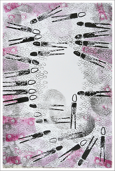 In der Serie "Gesprächsstoff", zu der diese Linografie gehört, spürte ich Qualitäten unserer alltäglichen Kommunikation nach: Wie sind die Teilnehmenden im Raum verteilt? Wie ist mein Bezug zu den anderen? Wie ist der Gesprächsfluss: leise plätschernd, ruhig strömend, kraftvoll, zerstörerisch...? Beim Zeichnen benutzte ich zusätzlich wiederkehrende Muster mit Hilfe von vorgefundenen oder aus Linoleum geschnittenen Stempeln, die meinen Eindruck in der Zeichnung unterstreichen.