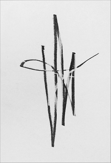 Jede der Linien stellt jeweils einen Pinselstrich von links nach rechts dar. Einzige Aufgabe dabei für mich war, den Pinsel an zwei Stellen im Blatt so weit anzuheben, dass nur noch dessen Spitze das Papier berührt und jeweils ein schmaler Strich entsteht. Der Pinsel muss am Anfang gut mit Tusche gefüllt sein, um die Linie bis zur anderen Seite ziehen zu können. Jeder dieser Striche erfordert Konzentration und ein ganz-bei-mir-sein. Ein innerliches Abschweifen der Gedanken, ein nicht-bei-der-Sache sein, zeigt der Tuschepinsel unweigerlich durch Unregelmäßigkeiten in der Strichführung.