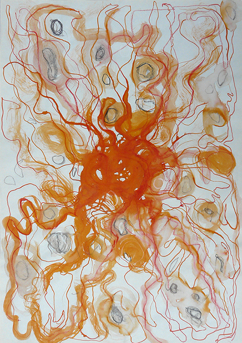 Für 2017 habe ich mir auf die Fahnen geschrieben, die Eigenarten von fließenden Grenzen künstlerisch zu untersuchen, etwa mit diesen Fragen: „Wie können Grenzen durchlässig bleiben?“ und „Wann wirken sie zu starr?“. Mit dem selbstgewählten Thema ging ich im März in einen konzentrierten Arbeitsprozess im Künstlerhaus Schloss Wiepersdorf. Dabei blieb ich im bildnerischen Arbeiten sehr dicht an der konkreten Erfahrung. So baute ich mir zunächst während des Zeichnens allerlei Hindernisse ein. Zeichnete gegen schwere Ziegelsteine, die ich auf den Blättern platzierte oder auch mal gegen Sand, weiche Textilien und menschliche Körper. Die dabei entstehenden Zeichnungen betrachte ich als Spuren dieses Prozesses, die ich mir wiederum unter den obigen Fragestellungen anschauen kann.
