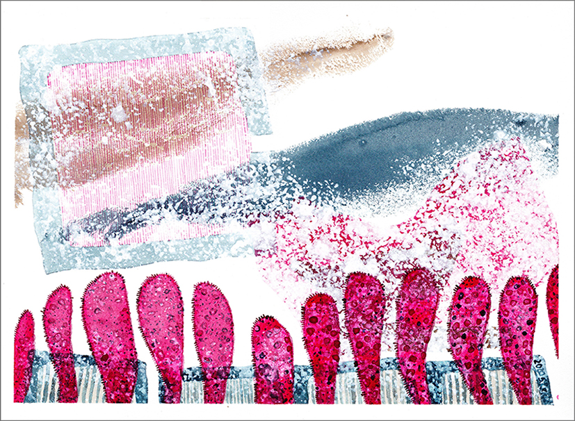 Hinhören bedeutet für mich: es geschehen zu lassen, mich einem inneren Fluss anzuvertrauen, ähnlich wie der Gärtner sich in den Fluss des Lebens begibt, nach bestem Wissen aussät, pflanzt und sich um das Wohlergehen der Pflanzen kümmert. Ihm bleibt am Ende nichts, als sich dem Wachsen anzuvertrauen und sich zu erfreuen. Was genau entsteht, kann er nicht bestimmen. Für mich sind die Bilder dieser Reihe ein Schritt des Loslassens. Ich gebe lediglich einen Rahmen vor und das Bild wächst aus sich heraus. Ohne beliebig zu sein, lasse ich zu und erfreue mich im Werden an der überraschenden Vielfalt und Lebendigkeit. Womit ich wieder bei meiner Art des Hinhörens ankomme.