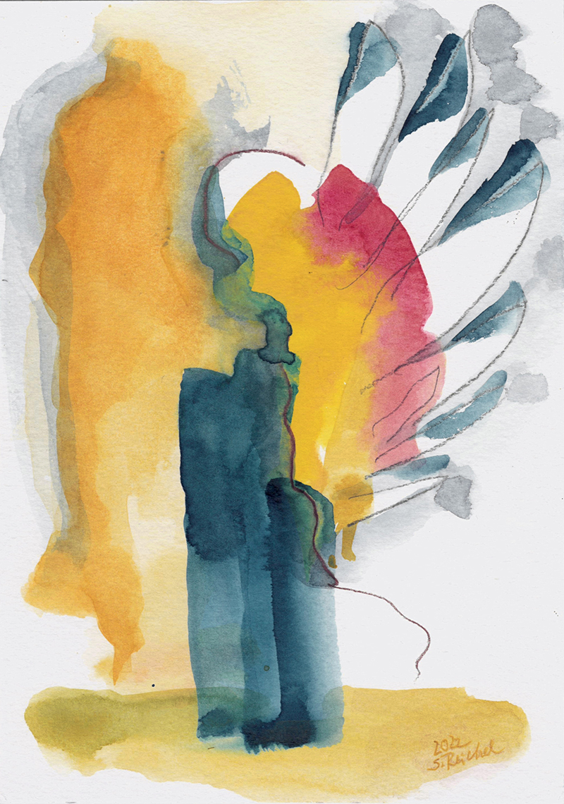 Von der Freude, der Überraschung, auch der Trauer oder dem Schmerz und dem weiten Raum, den es in Begegnungen zu entdecken gibt, erzählen diese Aquarelle.