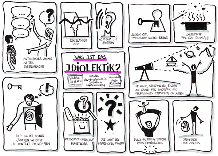 Die Idiolektik als Konzept und damit die Würdigung der Eigensprache bei meinen Gesprächspartner:innen begeistert mich für sehr verschiedene Lebensbereiche schon seit langem. Nadja Oehlmann und Tilman Rentel verbinden in diesem Buch ihr über Jahrzehnte gesammeltes Praxiswissen in der Traumatherapie mit dem Zugang der idiolektischen Haltung auf eine sehr verständliche Art. Ich freue mich, dass ich durch bildliche Umsetzungen an dem reichhaltigen Buch mitwirken konnte. Es ist im Mai 2023 im Carl-Auer-Verlag erschienen. Nicht nur für Therapeut:innen lesenswert!