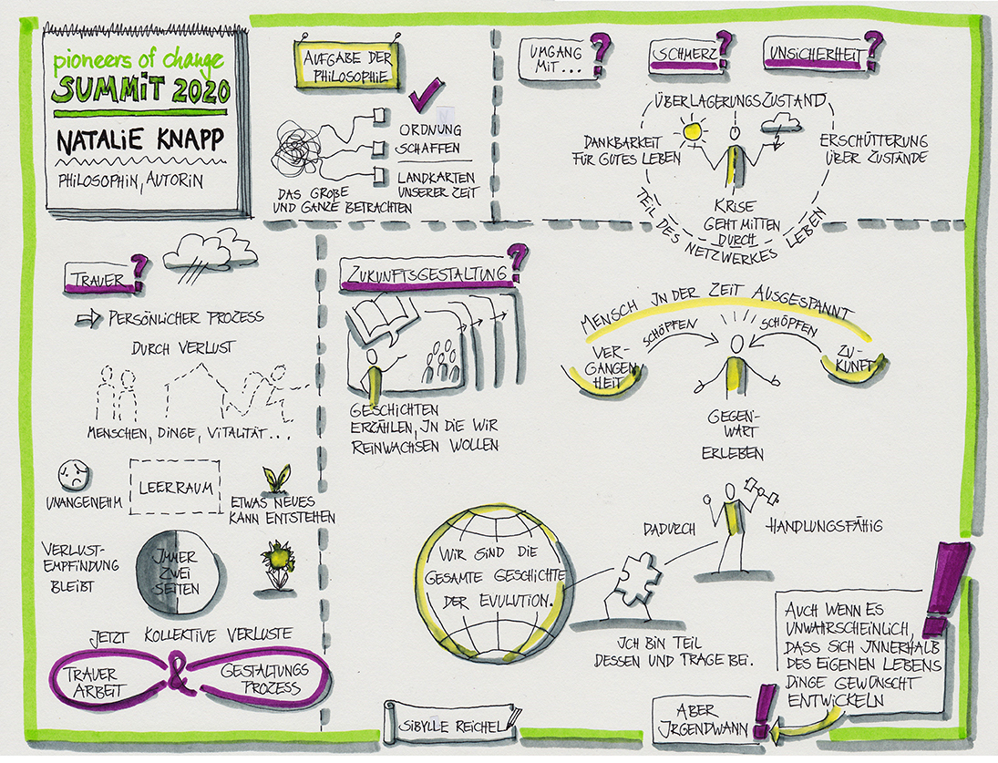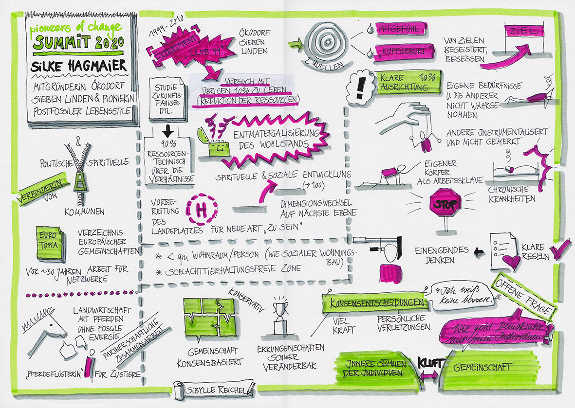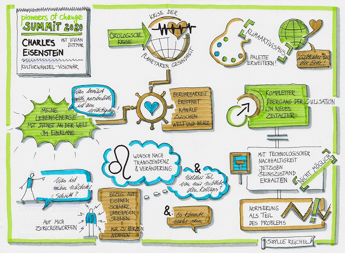 Im März 2020 sah ich es als meinen Beitrag, einige Interviews des Pioneers-of-change - Summits zur Klimakrise und zum Wandel in der Welt mitzuzeichnen. Hier unten können Sie sich diese Graphic Recordings anschauen.