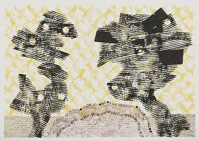 In der Serie "Gesprächsstoff", zu der diese Linografie gehört, spürte ich Qualitäten unserer alltäglichen Kommunikation nach: Wie sind die Teilnehmenden im Raum verteilt? Wie ist mein Bezug zu den anderen? Wie ist der Gesprächsfluss: leise plätschernd, ruhig strömend, kraftvoll, zerstörerisch...? Beim Zeichnen benutzte ich zusätzlich wiederkehrende Muster mit Hilfe von vorgefundenen oder aus Linoleum geschnittenen Stempeln, die meinen Eindruck in der Zeichnung unterstreichen.
