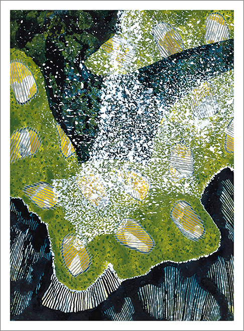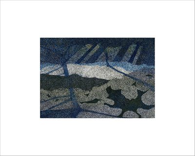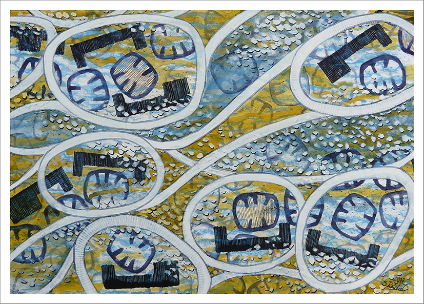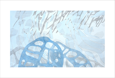 Vor einigen Jahren zeichnete ich in einer Serie von sechs Arbeiten einige Muster und Strukturen dazu. Das eisblaue Bild schien mir wegen seiner Farbigkeit nun für den Dezember als Angebot besonders passend.