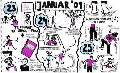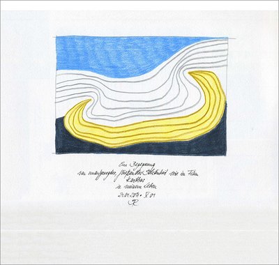 Dieses Bild hat im Jahr 2010 eine neue Phase in meiner Arbeit als Bildende Künstlerin eingeleitet, in der ich mich seitdem mehr der Zeichnung (von Bildern von Gesprächen und wie wir miteinander reden) zuwende. Die Arbeit entstand ganz spielerisch, ohne Absicht und erschien mir wie ein Traumbild. Für mich war dieser Traum eine Reise zu neuen Arbeitsfeldern (denen der Kommunikation und der visuellen Wahrnehmung davon) und vielen interessanten menschlichen Begegnungen.