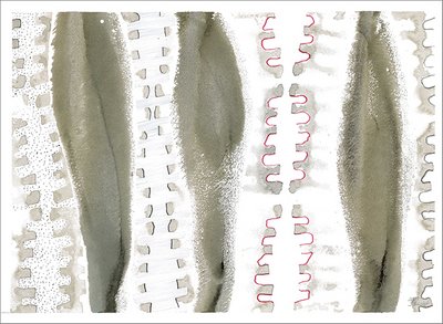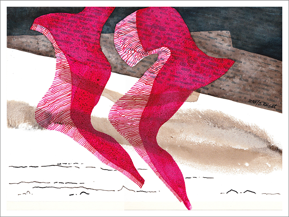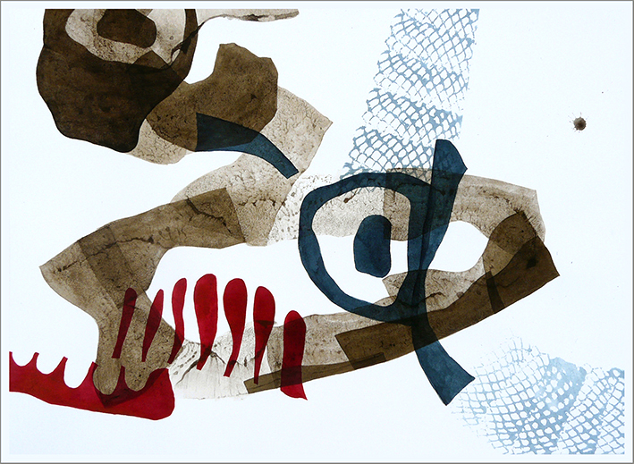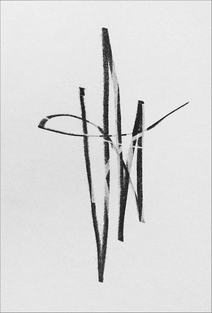 Für die Zeichnung „Darüberhinweg“ spannte ich Schnüre über das Blatt und ließ mich davon beim Zeichnen „stören“. Der Pinselstift „stolperte“ jeweils über die einzelnen Fäden und hinterließ Lücken. Oder sehen Sie Freiräume?