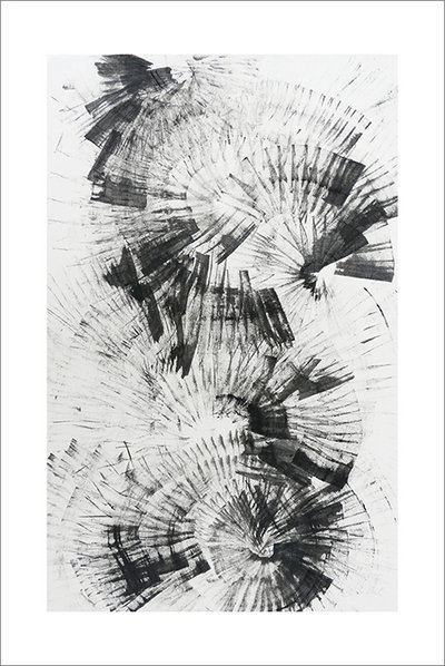 Im vergangenen Jahr wurde ich zu einer Druckwerkstatt nach Löhma eingeladen. Solche Angebote, das eigene Atelier zu verlassen, Neues auszuprobieren und zeitweilig gemeinsam mit Kollegen zu arbeiten, sind für mich sehr reizvoll. Bei diesen Gelegenheiten versuche ich, von meiner gewohnten Arbeitsweise einen Bogen zum Neuen zu schlagen. Das Neue waren für mich in diesem Fall die Drucktechniken. Das Gewohnte lag im absichtslosen Punkte setzen, im Entstehenlassen- über dieses Projekt habe ich bereits ausführlich geschrieben. ("Die Poesie der Absichtslosigkeit", Oktober 2013)