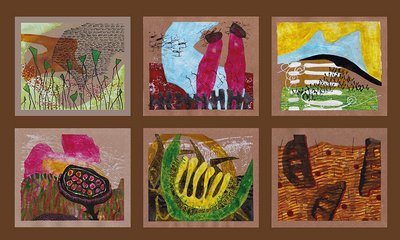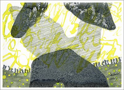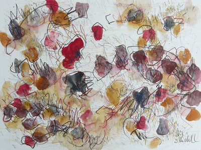 Hier möchte ich Ihnen sechs kleinformatige Arbeiten vorstellen, die ebenso in der Serie der "Poesie der Absichtslosigkeit" entstanden sind, wie schon das Bild im Oktober. Die Zeichnungen sind von mir als Einladung an Sie gedacht, sich im oftmals hektischen Alltag für einen Moment ganz dem Augenblick hinzugeben. -