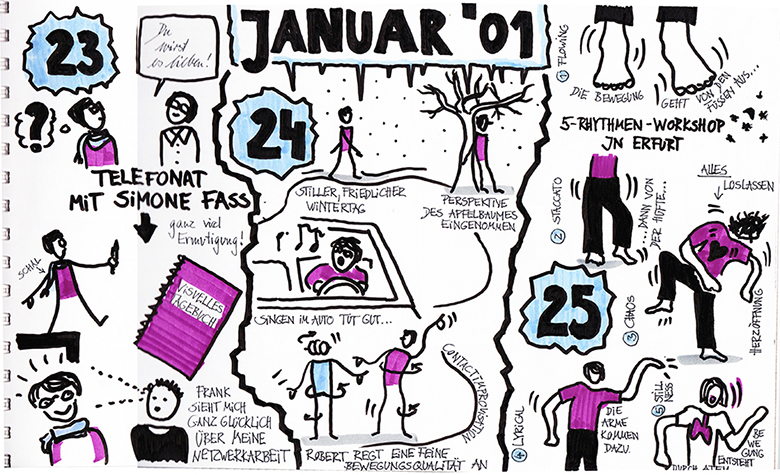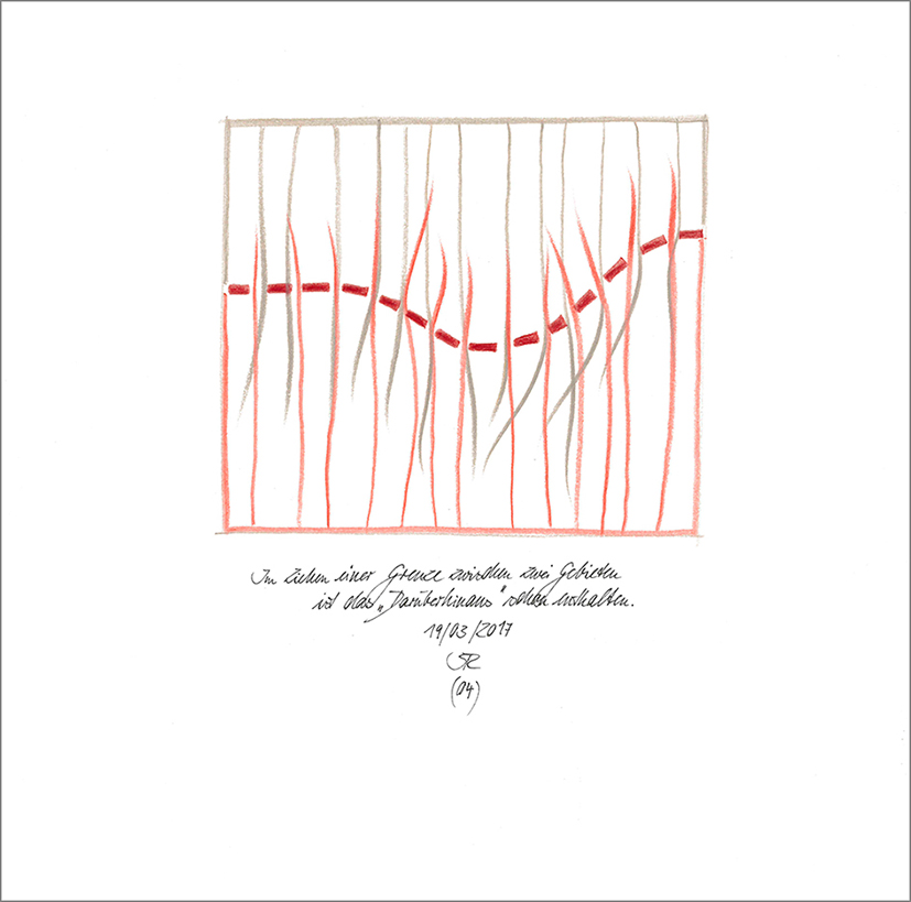 In meiner Arbeit bin ich gerade vielfach über Grenzen hinweg unterwegs (Kommunikation, Zeichnungen und Ausstellungen verbindend oder den Tanz und das Gespräch). Faszinierend daran finde ich das-über-Grenzen-gehen, denn ich erfahre im erfahrungsorientierten Lernen viel Bereicherung.