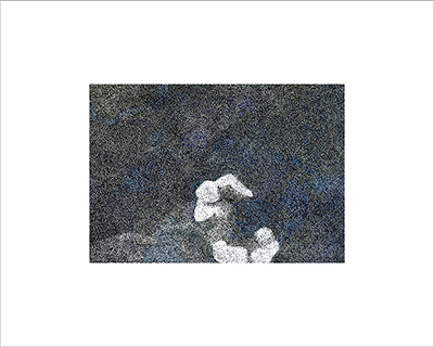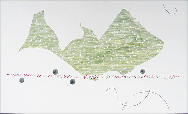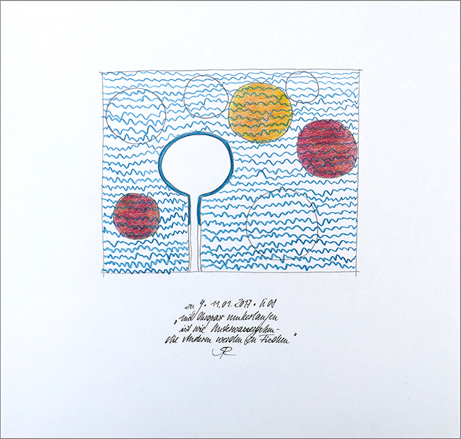 Diese Zeichnung gehört zu einer ganzen Reihe von Arbeiten, die in diesem Jahr enstanden sind. Sie hatten zwei Überschriften für mich: zum einen das Hinhören und zum anderen die Poesie der Absichtslosigkeit. Ich nutze oft das Telefon, um von Mötzelbach aus meine Kontakte aufrecht zu erhalten. Während zahlreicher Telefonate habe ich mich entschieden, dem achtsamen Hinhören in Form von absichtslos gepunkteten Bildern Ausdruck zu verleihen. Daraus entstand diese Reihe.
