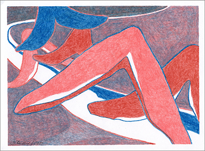 Die Zeichnung, die ich Ihnen für diesen Monat ausgesucht habe, entstand direkt neben der Tanzfläche. Während eines Tanzes erlebte ich in mir eine Bündelung von Kraft und Energie, die punktgenau in einem Sprung kulminierte. Dieses Hochgefühl übertrug ich unmittelbar auf das Papier.