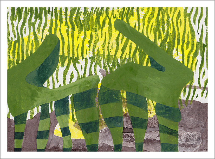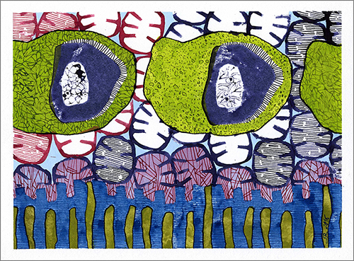 Noch einmal zur Verdeutlichung der Technik, weil ich danach oft gefragt wurde: Linografien sind Handdrucke mit vorgefundenen oder aus Linoleum geschnittenen Stempeln, kombiniert mit der klassischen Zeichnung.