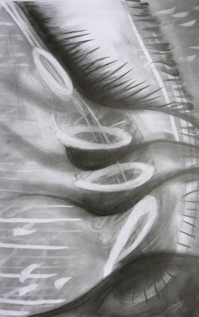 Mit Grafitpulver zeichne ich eher schwungvoll aus dem ganzen Körper heraus, fast schon vollführe ich einen Tanz auf dem Papier. Insofern ist diese Arbeit auch ein körperliches Nachvollziehen der realen Begegnung, eine Choreografie vielleicht.