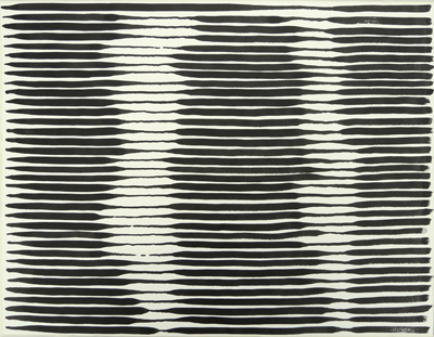 Jede der Linien stellt jeweils einen Pinselstrich von links nach rechts dar. Einzige Aufgabe dabei für mich war, den Pinsel an zwei Stellen im Blatt so weit anzuheben, dass nur noch dessen Spitze das Papier berührt und jeweils ein schmaler Strich entsteht. Der Pinsel muss am Anfang gut mit Tusche gefüllt sein, um die Linie bis zur anderen Seite ziehen zu können. Jeder dieser Striche erfordert Konzentration und ein ganz-bei-mir-sein. Ein innerliches Abschweifen der Gedanken, ein nicht-bei-der-Sache sein, zeigt der Tuschepinsel unweigerlich durch Unregelmäßigkeiten in der Strichführung.