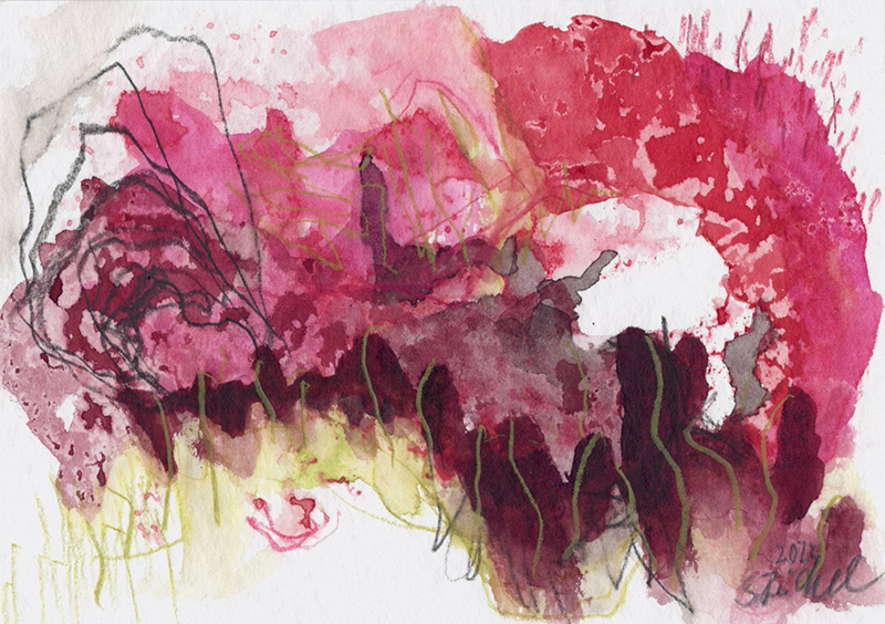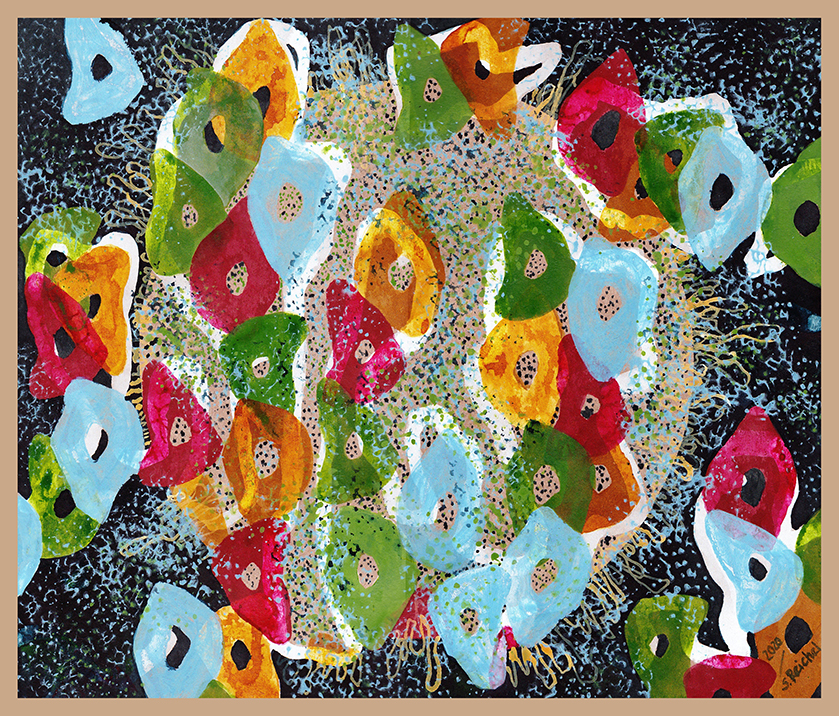 Hinhören bedeutet für mich: es geschehen zu lassen, mich einem inneren Fluss anzuvertrauen, ähnlich wie der Gärtner sich in den Fluss des Lebens begibt, nach bestem Wissen aussät, pflanzt und sich um das Wohlergehen der Pflanzen kümmert. Ihm bleibt am Ende nichts, als sich dem Wachsen anzuvertrauen und sich zu erfreuen. Was genau entsteht, kann er nicht bestimmen. Für mich sind die Bilder dieser Reihe ein Schritt des Loslassens. Ich gebe lediglich einen Rahmen vor und das Bild wächst aus sich heraus. Ohne beliebig zu sein, lasse ich zu und erfreue mich im Werden an der überraschenden Vielfalt und Lebendigkeit. Womit ich wieder bei meiner Art des Hinhörens ankomme.